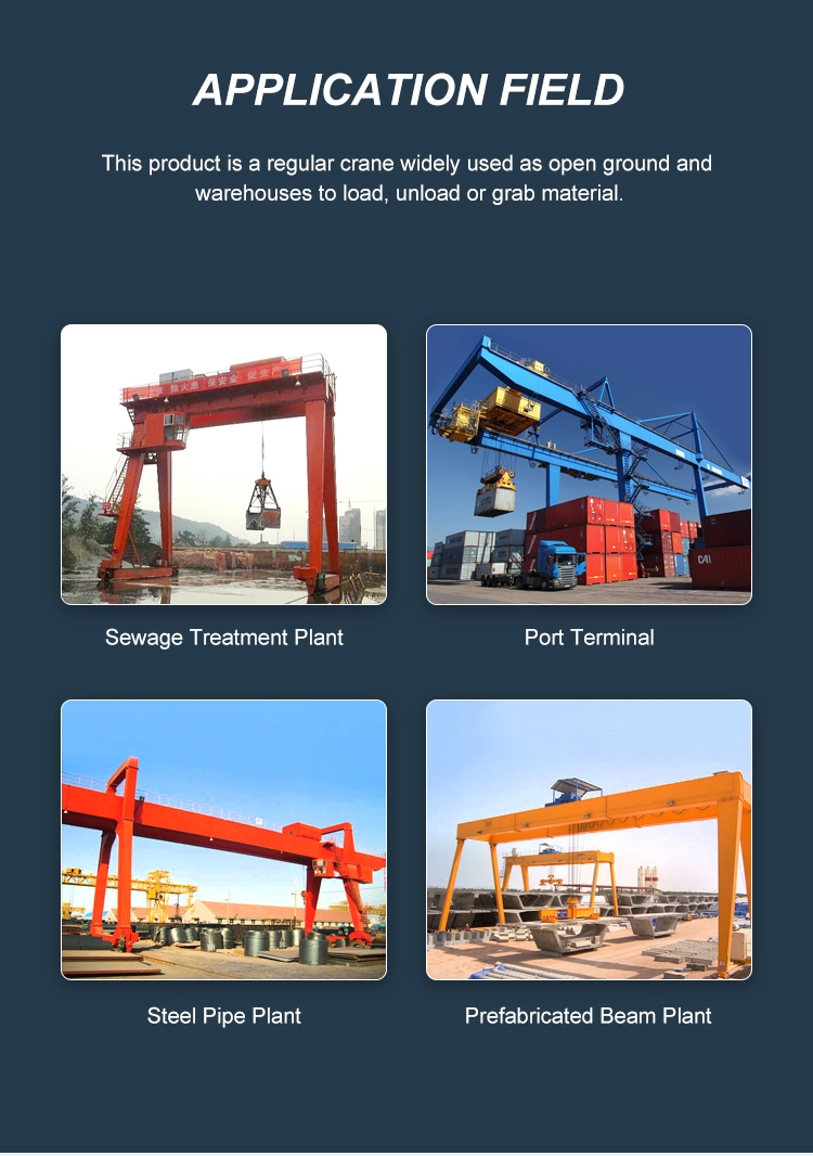 Esta grúa pórtico está diseñada y fabricada de acuerdo con GB/T 14406"Grúa pórtico general". Se aplica ampliamente al almacén abierto o al carril para trabajos generales de manipulación y elevación; también puede equiparse con muchos dispositivos de elevación para trabajos especiales; mientras que está prohibido levantar soluciones a alta temperatura, inflamables, explosivas, corrosión, sobrecarga, polvo y otras operaciones peligrosas.
